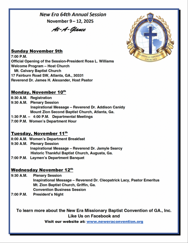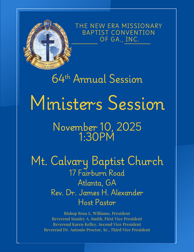 I am the Pastor of Greater Fellowship Baptist Church in Decatur, Ga. I joined New Era Missionary Baptist State Convention of Georgia to be a part of a Baptist fellowship that is committed to obey the call of Christ Jesus to “Go therefore and make disciples of all the nations”; to participate in the teaching, preaching, and reaching of people for God’s kingdom building through the good works of Social Justice and peace through the power of the Holy Spirit.